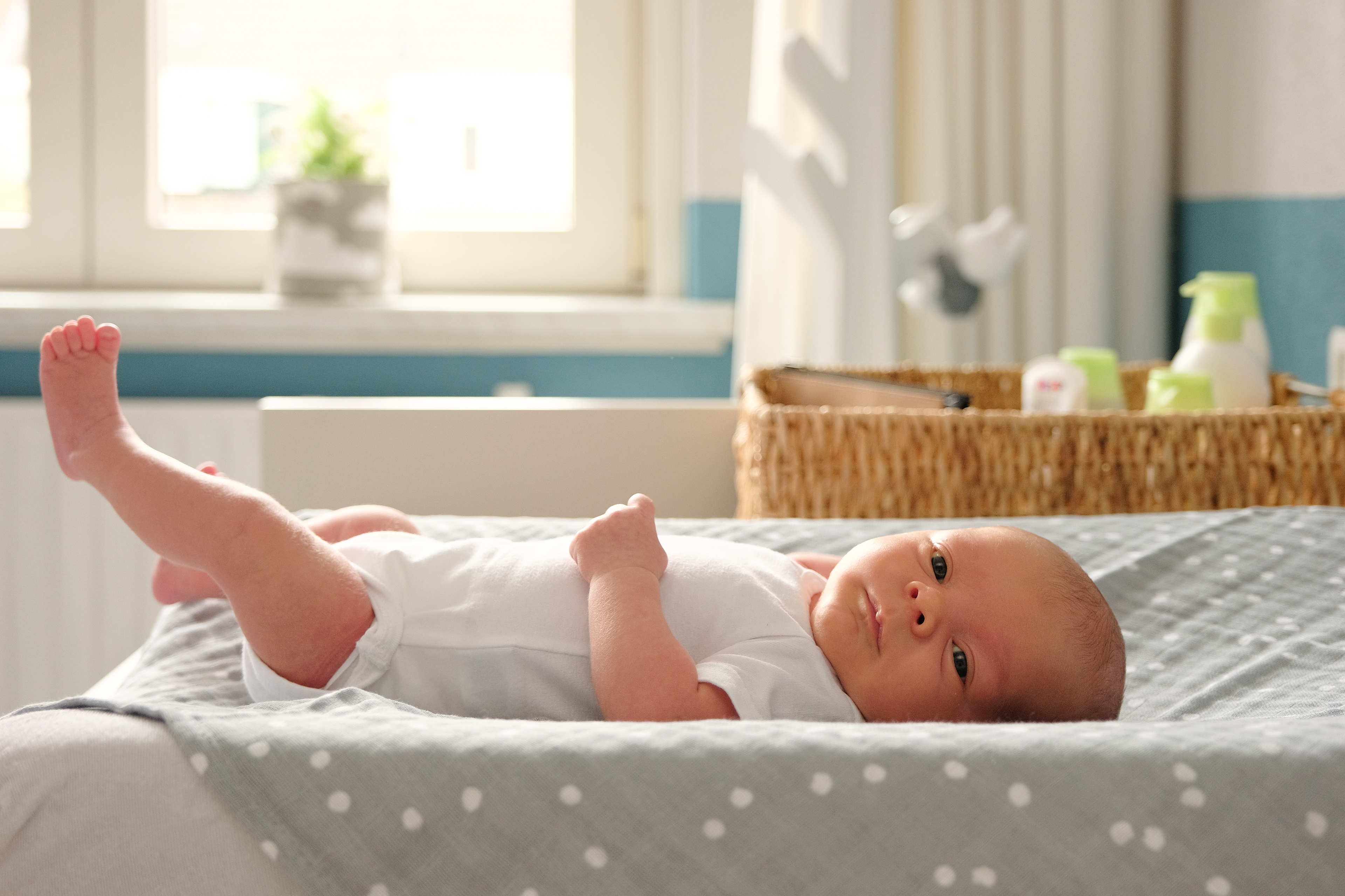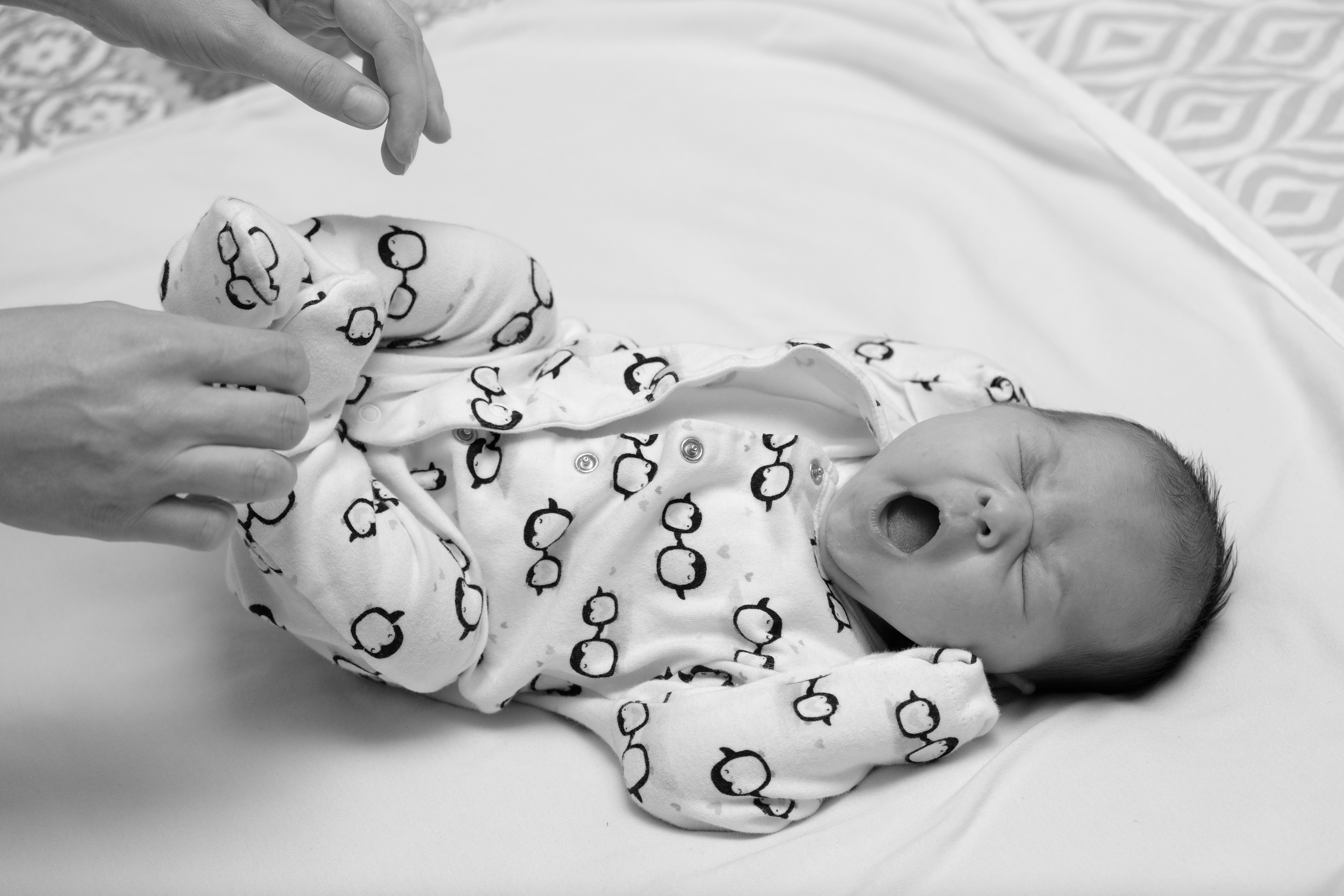 Ik leg de baby niet in rare poses, maar gewoon op bed, zoals hij/zij zelf normaal ook ligt. Geen poespas dus.